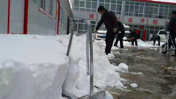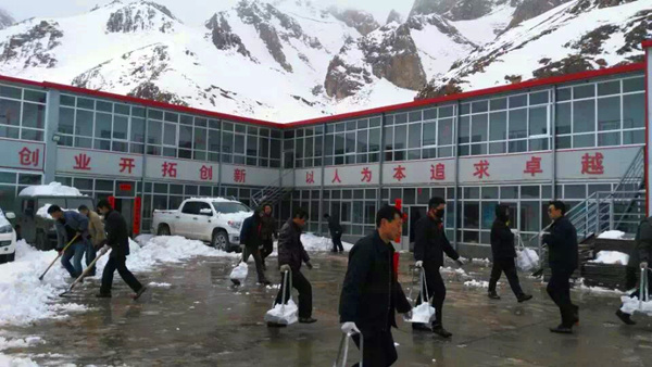 2016年3月21日青海共和縣青海銅鑫礦業(yè)有限公司礦區(qū)迎來了自春節(jié)以來的第一場大雪,前幾這里還太陽高照,天氣晴朗,與此同時洛陽陽光明媚,鳥語花香,現(xiàn)在青海銅鑫礦區(qū)則被厚厚的白雪覆蓋,呈現(xiàn)出另一番別樣的景像。青海分公司員工也一起參加礦山工作區(qū)的除雪工作,個個干得熱火朝天,一會兒大院里的雪就被清理完畢。