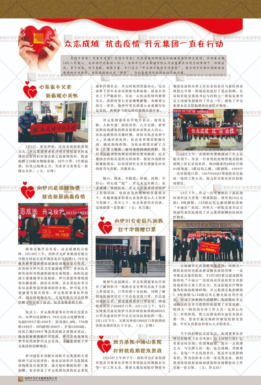 洛陽(yáng)開(kāi)元礦業(yè)集團(tuán)有限公司簡(jiǎn)介洛陽(yáng)開(kāi)元礦業(yè)集團(tuán)有限公司,始成立于2006年,位于洛陽(yáng)市開(kāi)元大道269號(hào)。集團(tuán)旗下共有五余家全資子公司,業(yè)務(wù)涉及有色金屬礦山開(kāi)發(fā)、礦產(chǎn)品購(gòu)銷(xiāo)與進(jìn)出口貿(mào)易、房地產(chǎn)開(kāi)發(fā)、文化藝術(shù)、企業(yè)管理與咨詢、資本投資等多個(gè)領(lǐng)域。民建河南省委委員、民建河南省委企業(yè)委副主任、民建洛陽(yáng)市委委員、企業(yè)委主任、洛陽(yáng)民建企業(yè)家協(xié)會(huì)會(huì)長(zhǎng)許明月是公司創(chuàng)始人,現(xiàn)任洛陽(yáng)開(kāi)元礦業(yè)集團(tuán)有限公司董事長(zhǎng)。在礦業(yè)領(lǐng)域,洛陽(yáng)開(kāi)元礦業(yè)集團(tuán)擁有多家實(shí)力雄厚的子公司:貴州開(kāi)元礦業(yè)有限公司探、采礦權(quán)面積共11.33平方公里;興??h銅鑫礦業(yè)有限公司探礦權(quán)面積8.76平方公里,礦山資源潛力巨大;2021年,開(kāi)元集團(tuán)與盧氏中科礦業(yè)有限公司開(kāi)展戰(zhàn)略合作。盧氏中科礦業(yè)有限公司專(zhuān)注于有色金屬的浮選、加工和銷(xiāo)售,擁有強(qiáng)大的技術(shù)支撐平臺(tái),是集探、采、選、冶、研為一體的中大型綜合礦業(yè)企業(yè)。目前,盧氏中科王家河1000噸選礦廠已成功投產(chǎn),雙河金礦、柳關(guān)欒盧鉛鋅礦相繼順利開(kāi)工,樓房銀礦與圪老灣鉛鋅礦的深部探礦重大突破,標(biāo)志著礦山版圖取得重大進(jìn)展,為開(kāi)元集團(tuán)后續(xù)發(fā)展奠定了堅(jiān)實(shí)基礎(chǔ)。在文化傳媒領(lǐng)域,洛陽(yáng)市明月美術(shù)館通過(guò)豐富多樣的藝術(shù)展覽、學(xué)術(shù)研討和公共教育活動(dòng),努力打造一個(gè)集展覽、交流、教育、研究為一體的綜合性藝術(shù)平臺(tái)。此外,在金融投資領(lǐng)域,開(kāi)元集團(tuán)旗下的北京明峰資本管理有限公司專(zhuān)注于投資具有高增長(zhǎng)潛力的優(yōu)秀企業(yè),特別是高科技、新能源、環(huán)保等新興產(chǎn)業(yè),為客戶提供個(gè)性化的資產(chǎn)配置服務(wù)。在做好企業(yè)經(jīng)營(yíng)的同時(shí),開(kāi)元集團(tuán)始終不忘企業(yè)的社會(huì)責(zé)任和家國(guó)情懷,以突出的愛(ài)心公益事跡,開(kāi)展了一系列公益慈善活動(dòng):“民建林”公益事業(yè)通過(guò)“思源基金”“幫幫公益”線上公益平臺(tái),與眾多愛(ài)心人士籌措資金20余萬(wàn)元;資助541名貧困大學(xué)生共計(jì)270余萬(wàn)元,推進(jìn)“數(shù)字助力——河南AI人才培養(yǎng)”;捐款10萬(wàn)元,馳援京津冀、黑龍江洪水地質(zhì)災(zāi)害……公司于2017年底被洛陽(yáng)市慈善總會(huì)評(píng)為“洛陽(yáng)慈善風(fēng)云榜——十大愛(ài)心集體”。洛陽(yáng)開(kāi)元礦業(yè)集團(tuán)有限公司秉承持續(xù)發(fā)展理念,憑借多年來(lái)良好的企業(yè)信譽(yù)與經(jīng)營(yíng)業(yè)績(jī),與全國(guó)多家企業(yè)建立了良好合作關(guān)系,受到社會(huì)各界的一致好評(píng),多次榮獲“納稅標(biāo)兵”“先進(jìn)企業(yè)”“招商引資模范企業(yè)”等榮譽(yù)稱號(hào)。回望來(lái)時(shí)路,開(kāi)元人勠力同心,以“闖”的精神和“創(chuàng)”的勁頭,一路披荊斬棘,踏過(guò)千山萬(wàn)水;展望新未來(lái),開(kāi)元人凝心聚力,不執(zhí)于“舊”,無(wú)畏于“新”,秉承“勇于跨越,追求卓越”的企業(yè)精神,乘著國(guó)家高質(zhì)量發(fā)展新征程的東風(fēng),跨過(guò)高山,越過(guò)大海,向著集團(tuán)多元化、國(guó)際化的目標(biāo),逐夢(mèng)遠(yuǎn)航,跨越前行!