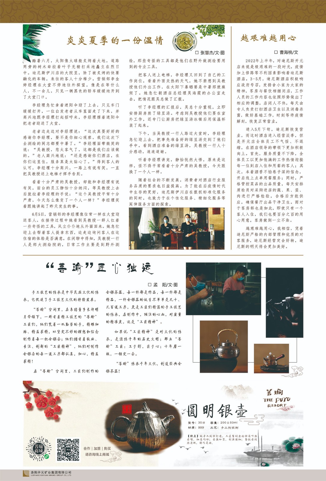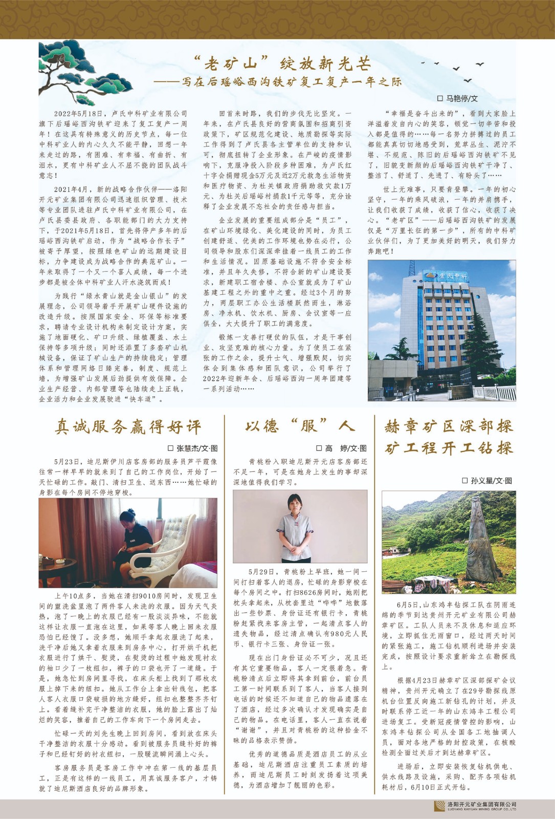 洛陽(yáng)開(kāi)元礦業(yè)集團(tuán)有限公司簡(jiǎn)介洛陽(yáng)開(kāi)元礦業(yè)集團(tuán)有限公司,始成立于2006年,位于洛陽(yáng)市開(kāi)元大道269號(hào)。集團(tuán)旗下共有五余家全資子公司,業(yè)務(wù)涉及有色金屬礦山開(kāi)發(fā)、礦產(chǎn)品購(gòu)銷(xiāo)與進(jìn)出口貿(mào)易、房地產(chǎn)開(kāi)發(fā)、文化藝術(shù)、企業(yè)管理與咨詢、資本投資等多個(gè)領(lǐng)域。民建河南省委委員、民建河南省委企業(yè)委副主任、民建洛陽(yáng)市委委員、企業(yè)委主任、洛陽(yáng)民建企業(yè)家協(xié)會(huì)會(huì)長(zhǎng)許明月是公司創(chuàng)始人,現(xiàn)任洛陽(yáng)開(kāi)元礦業(yè)集團(tuán)有限公司董事長(zhǎng)。在礦業(yè)領(lǐng)域,洛陽(yáng)開(kāi)元礦業(yè)集團(tuán)擁有多家實(shí)力雄厚的子公司:貴州開(kāi)元礦業(yè)有限公司探、采礦權(quán)面積共11.33平方公里;興??h銅鑫礦業(yè)有限公司探礦權(quán)面積8.76平方公里,礦山資源潛力巨大;2021年,開(kāi)元集團(tuán)與盧氏中科礦業(yè)有限公司開(kāi)展戰(zhàn)略合作。盧氏中科礦業(yè)有限公司專注于有色金屬的浮選、加工和銷(xiāo)售,擁有強(qiáng)大的技術(shù)支撐平臺(tái),是集探、采、選、冶、研為一體的中大型綜合礦業(yè)企業(yè)。目前,盧氏中科王家河1000噸選礦廠已成功投產(chǎn),雙河金礦、柳關(guān)欒盧鉛鋅礦相繼順利開(kāi)工,樓房銀礦與圪老灣鉛鋅礦的深部探礦重大突破,標(biāo)志著礦山版圖取得重大進(jìn)展,為開(kāi)元集團(tuán)后續(xù)發(fā)展奠定了堅(jiān)實(shí)基礎(chǔ)。在文化傳媒領(lǐng)域,洛陽(yáng)市明月美術(shù)館通過(guò)豐富多樣的藝術(shù)展覽、學(xué)術(shù)研討和公共教育活動(dòng),努力打造一個(gè)集展覽、交流、教育、研究為一體的綜合性藝術(shù)平臺(tái)。此外,在金融投資領(lǐng)域,開(kāi)元集團(tuán)旗下的北京明峰資本管理有限公司專注于投資具有高增長(zhǎng)潛力的優(yōu)秀企業(yè),特別是高科技、新能源、環(huán)保等新興產(chǎn)業(yè),為客戶提供個(gè)性化的資產(chǎn)配置服務(wù)。在做好企業(yè)經(jīng)營(yíng)的同時(shí),開(kāi)元集團(tuán)始終不忘企業(yè)的社會(huì)責(zé)任和家國(guó)情懷,以突出的愛(ài)心公益事跡,開(kāi)展了一系列公益慈善活動(dòng):“民建林”公益事業(yè)通過(guò)“思源基金”“幫幫公益”線上公益平臺(tái),與眾多愛(ài)心人士籌措資金20余萬(wàn)元;資助541名貧困大學(xué)生共計(jì)270余萬(wàn)元,推進(jìn)“數(shù)字助力——河南AI人才培養(yǎng)”;捐款10萬(wàn)元,馳援京津冀、黑龍江洪水地質(zhì)災(zāi)害……公司于2017年底被洛陽(yáng)市慈善總會(huì)評(píng)為“洛陽(yáng)慈善風(fēng)云榜——十大愛(ài)心集體”。洛陽(yáng)開(kāi)元礦業(yè)集團(tuán)有限公司秉承持續(xù)發(fā)展理念,憑借多年來(lái)良好的企業(yè)信譽(yù)與經(jīng)營(yíng)業(yè)績(jī),與全國(guó)多家企業(yè)建立了良好合作關(guān)系,受到社會(huì)各界的一致好評(píng),多次榮獲“納稅標(biāo)兵”“先進(jìn)企業(yè)”“招商引資模范企業(yè)”等榮譽(yù)稱號(hào)?;赝麃?lái)時(shí)路,開(kāi)元人勠力同心,以“闖”的精神和“創(chuàng)”的勁頭,一路披荊斬棘,踏過(guò)千山萬(wàn)水;展望新未來(lái),開(kāi)元人凝心聚力,不執(zhí)于“舊”,無(wú)畏于“新”,秉承“勇于跨越,追求卓越”的企業(yè)精神,乘著國(guó)家高質(zhì)量發(fā)展新征程的東風(fēng),跨過(guò)高山,越過(guò)大海,向著集團(tuán)多元化、國(guó)際化的目標(biāo),逐夢(mèng)遠(yuǎn)航,跨越前行!